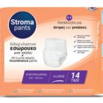 Τα εσώρουχα μιας χρήσης Stroma Pants παρέχουν διακριτική άνεση και αξιόπιστη προστασία απέναντι σε μέτρια & μεγάλης μορφής ακράτεια, σε δραστήριους άνδρες και γυναίκες. Τα εσώρουχα Stroma Pants έχουν πλαϊνά φράγματα ώστε να προσφέρουν σίγουρη προστασία από διαρροές ακριβώς εκεί που χρειάζεται. H υφασμάτινη αεροδιαπερατή εξωτερική επένδυση μειώνει τον κίνδυνο ερεθισμών και κρατάει το δέρμα στεγνό. Η καινοτόμα τεχνολογία Odor Guard μειώνει την δημιουργία οσμών.